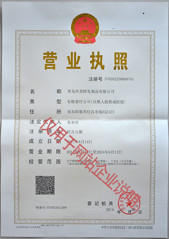 2015年11月,新加坡客户指定供应商 2016年04月,丝美特公司淘宝企业店铺上线 2016年07月,与天猫店铺商合作,先后推出3款爆款。 营业执照 ![]() 丝美特产品商标“丝美特恩” ![]() (责任编辑:admin)(版权提示:青岛丝美特原创文章,转载请注明出处。) |